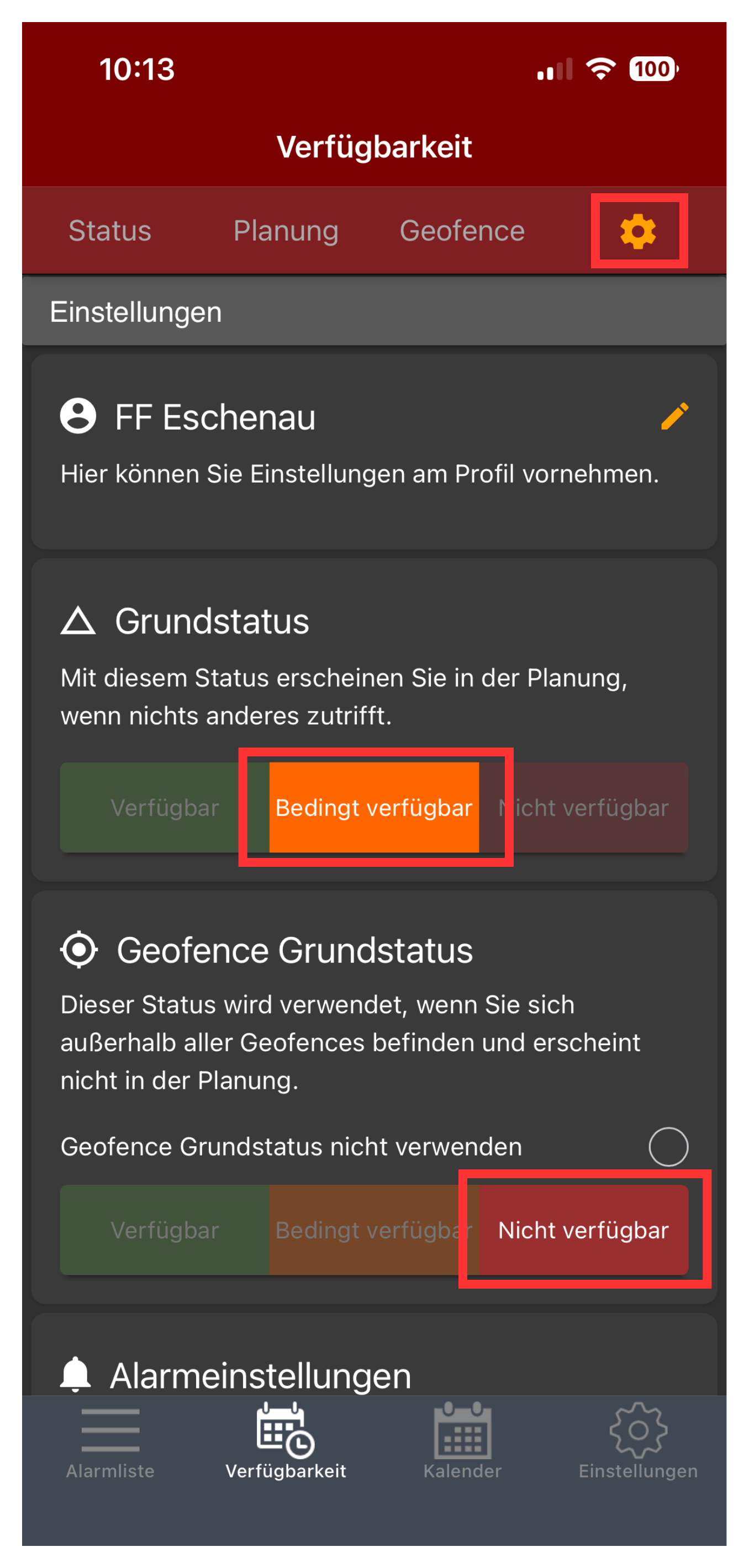 3. In die Einstellungen gehen, dort Grundstatus auf Bedingt verfügbar und Geofence Grundstatus auf Nicht verfügbar setzen