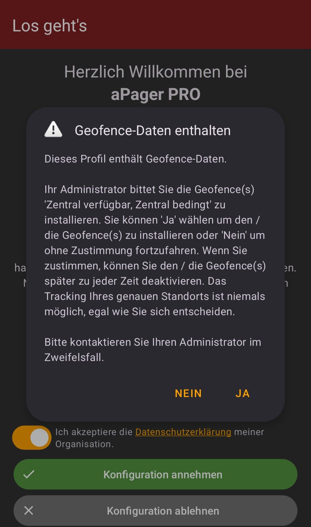 Direkt nach dem Annehmen der Konfiguration erscheint eine Aufforderung zum Aktivieren vom Geofencing