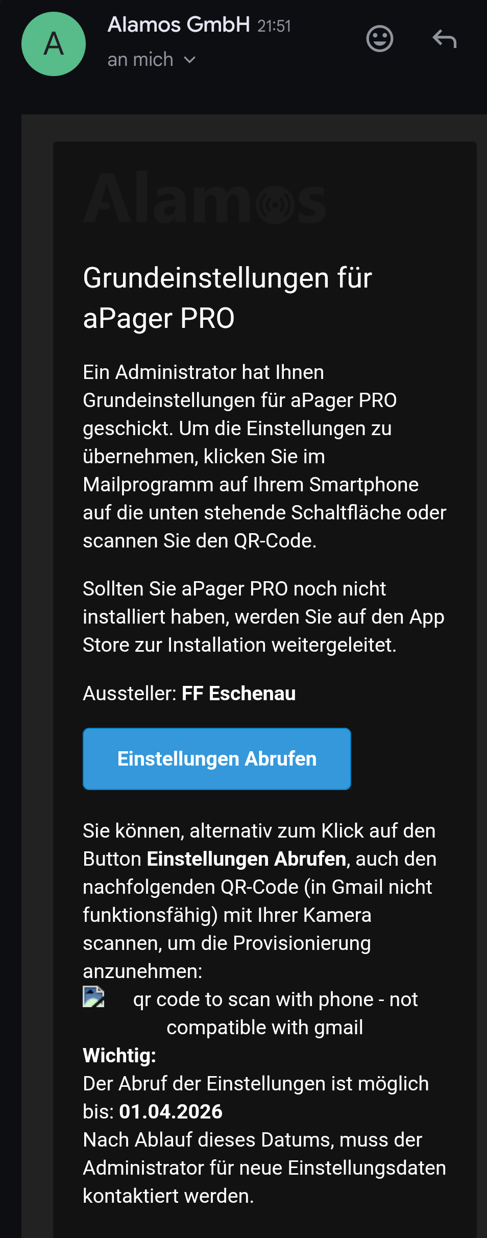 Zur Einrichtung der App kommt ein Provisionierungspaket an die hinterlegte E-Mail