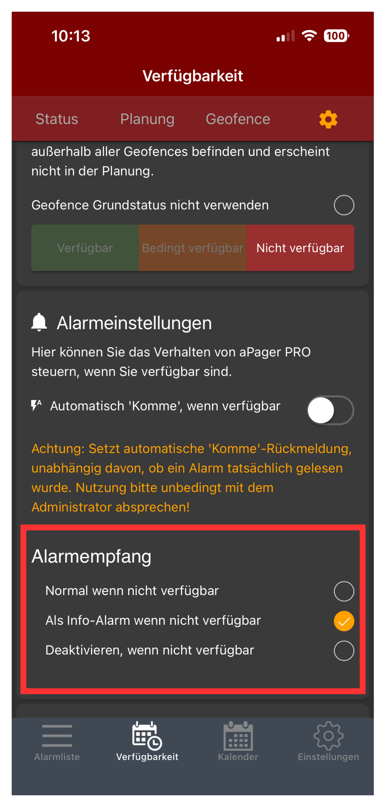 Für dein Einzelnen hat es den Vorteil, dass das Alarmverhalten anhand der Verfügbarkeit konfiguriert werden kann. So kann z.B. eingestellt werden, dass die Alarmierung automatisch stumm geschaltet wird, wenn man sich weit weg vom Feuerwehrhaus (z.B. auf Arbeit) befindet.